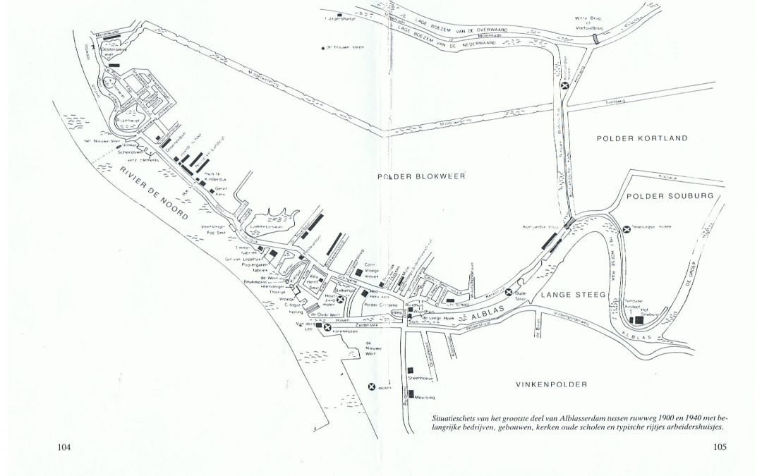 Situatieschets van het grootste deel van Alblasserdam tussen ruwweg 1900 en 1940 met belangrijke bedrijven, gebouwen, kerken oude scholen en typische rijtjes arbeidershuisjes. Zoals te zien heeft de Polderstraat nog een zijstraat namelijk de ‘Koolsingel’. Deze zijstraat is ergens tussen 1965 en 1970 afgebroken.