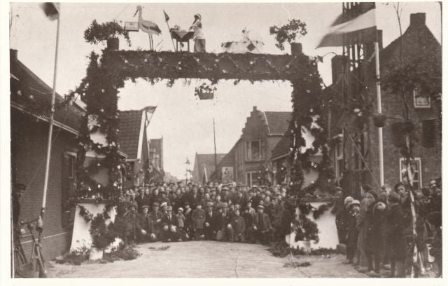De Polderstraat wachtte in 1938 gespannen af, want er zou een koningskind geboren worden. In 2 buurten werden erepoorten gebouwd en de huizen alvast versierd ter gelegenheid van het feit, dat onze toenmalige kroonprinses Juliana in verwachting was van haar eerste kindje. Bas Twigt, Kees Spruit en Gerrit Baan staan als promotoren op deze foto Toen het prinsesje geboren was vierde Alblasserdam uitbundig feest De erepoort stond ter hoogte van de hoek Oranjestraat-Polderstraat. Zie blad 76 van `Kent u ze nog… De Alblasserdamers`