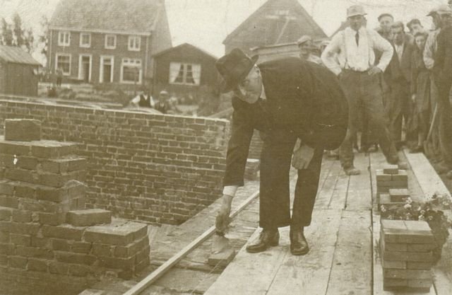 Eerste steenlegging van het nieuwe Waardhuis. Door de voorzitter C. Verhoef van de Nederwaard. Links achter nieuwe woningen van W. Broere en J.P. Veen aan de Polderstraat. Midden het noodcafé van van Krimpen.