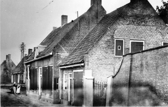 Polderstaat vanaf de Dam, richting Oranjestraat. Rechts de boerderij van Gerrit Baan. Net na de muur de arbeidershuisjes behorende bij de boerderij.   Dit huis is waarschijnlijk de smederij geweest van de 1ste “Smitten”. Zie blad 123 van “Zo was het vroeger” Zie ook CO152 in FotoBank.